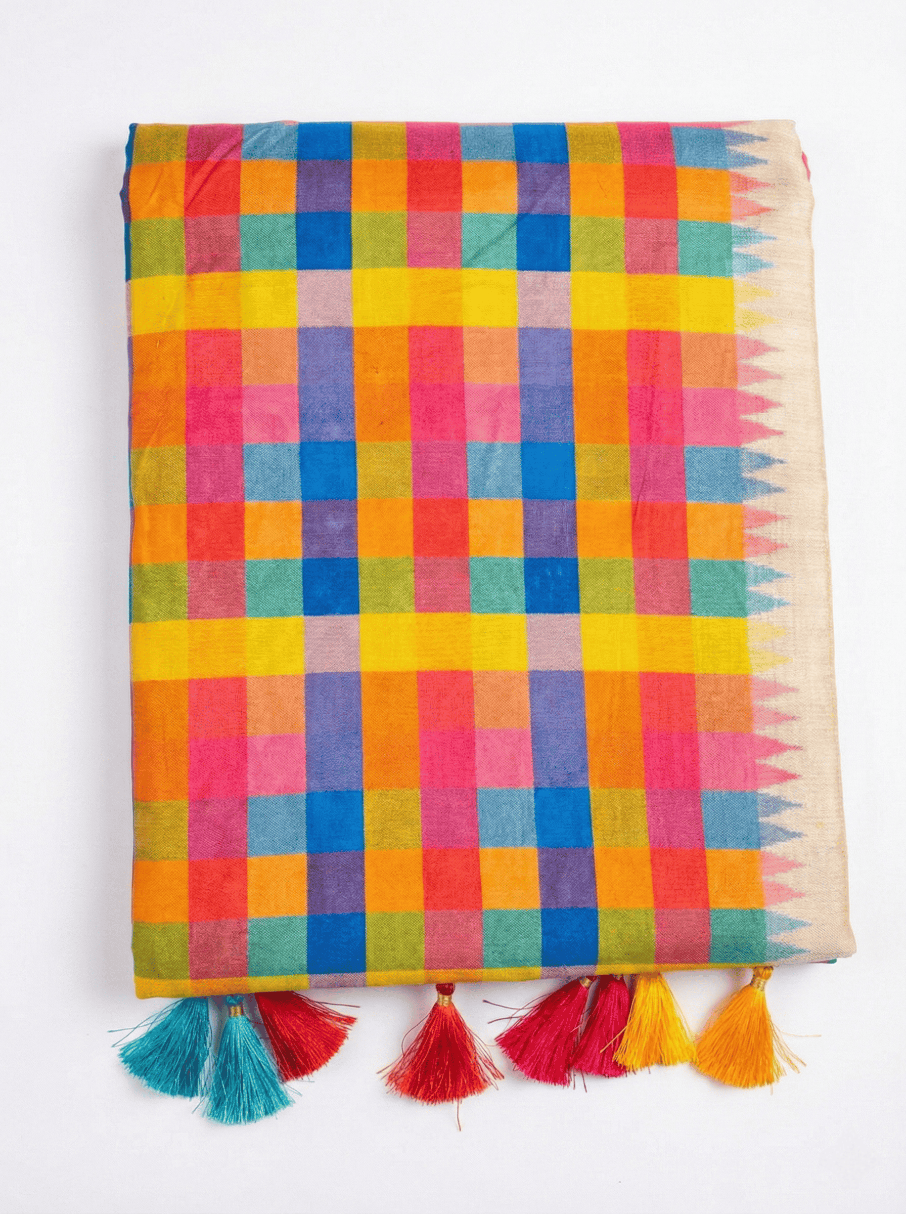 Anitya Official Women’s Soft Tussar Silk Saree with Rich Look Multi-Color Checkered Print and Striped Blouse Piece